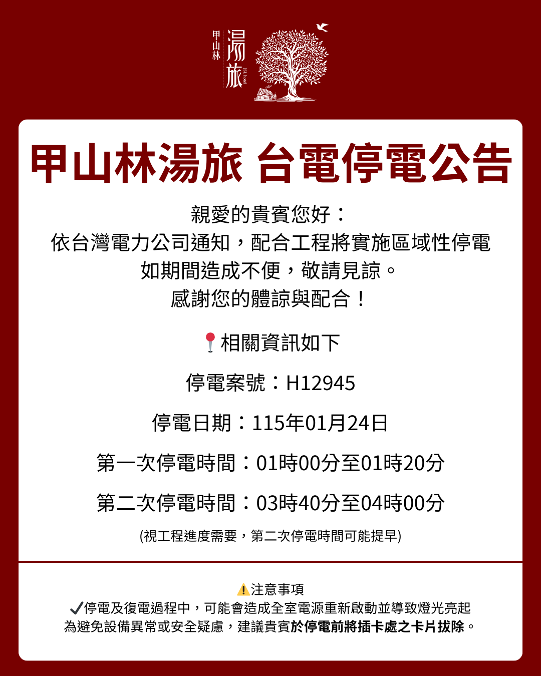 null 住房優惠 甲山林湯旅🪧台電停電公告 親愛的貴賓您好: 依台灣電力公司通知 因配合工程需要,將實施區域性停電 📍相關資訊如下 停電案號:H12945 停電日期:115年01月24日 第一次停電時間:01時00分至01時20分 第二次停電時間:03時40分至04時00分 (視工程進度需要,第二次停電時間可能提早) ⚠️注意事項 ✔️停電及復電過程中,可能會造成全室電源重新啟動並導致燈光亮起,為避免設備異常或安全疑慮,建議貴賓於停電前將插卡處之卡片拔除。 最後,期間如造成不便敬請見諒 感謝您的體諒與配合! 更多資訊 閱讀完畢