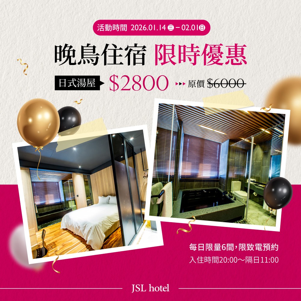 null 住房優惠 1月限時優惠🔥平日晚鳥住宿超優惠💖 ♨️舒心享受日式湯屋 高品質住宿♨️ 📆 活動期間|2026/01/14~02/01 ♨️ 日式湯屋住宿・專案特惠 $2,800(原價 $6,000) 📆日~三限定|每日限量6間 🕗入住時間|20:00~隔日 11:00 ✔保證平日最低價 ♨️城中秘境|享受烏來直送美人湯 🛀舒適空間|雙人大浴缸、大床舖 🚗免費停車|數量有限、提前登記 ⚠️ 使用限制 ✅僅限 週日~週三入住 ✅僅限電話或 Email 預約 ✅數量有限,售完即止 LINE 好友加碼 → 再折 $100 👉 https://urli.ai/jgXln7W8 【#甲山林湯旅】 📞 預約專線|02-2501-2222 📍 地址|台北市中山區興安街 60 號 ⚠️ 注意事項 甲山林湯旅保留隨時修改、變更、暫停或終止本活動內容之權利。 相關變更或詳細規範將公告於官方粉絲頁,恕不另行通知。 更多資訊 閱讀完畢